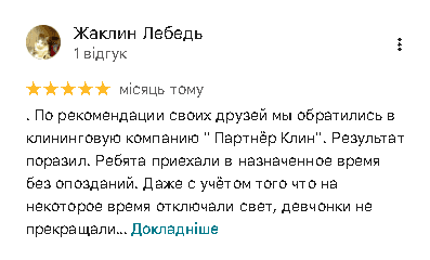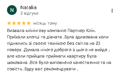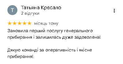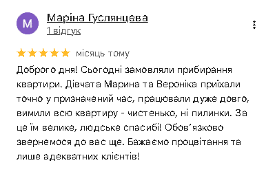 Якщо ми запізнимося, зробимо знижку 10% на все прибирання або почистимо одну одиницю меблі за наш рахунок.